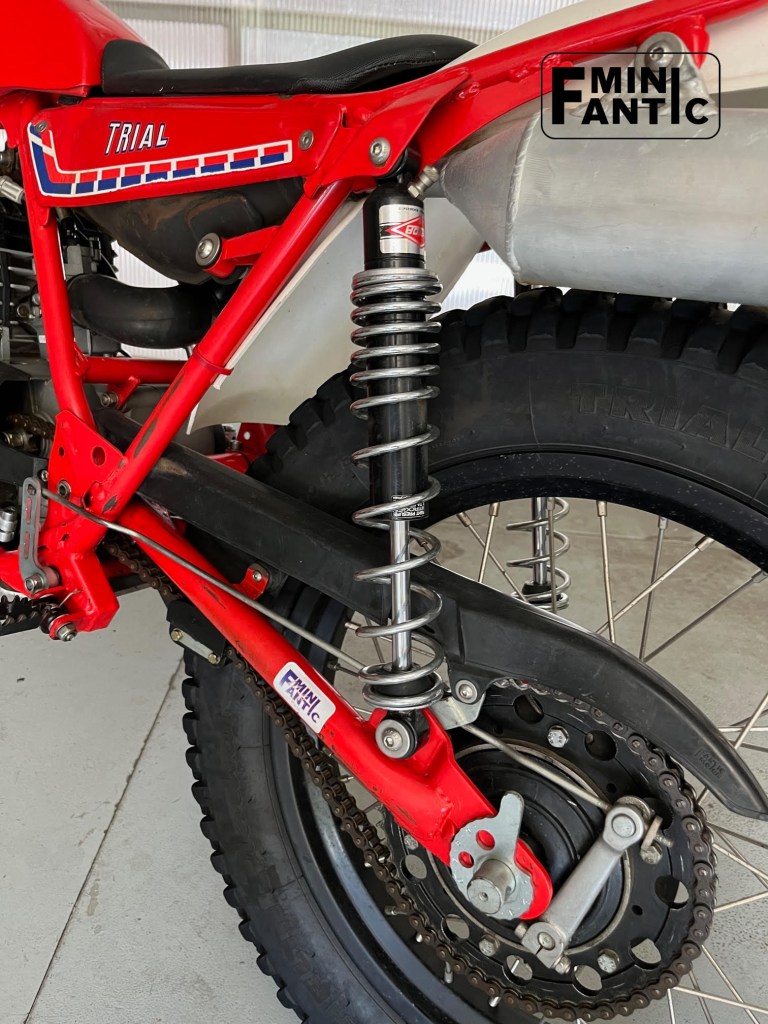 2 Trial shock absorbers with independent gas chamber inside the tube. Silentblocks at the top and bottom. With its simplicity you get good performance, both dry and wet. The gas load and spring preload are adjustable and are repairable. Distance 340 mm, with 12×2 anchors.