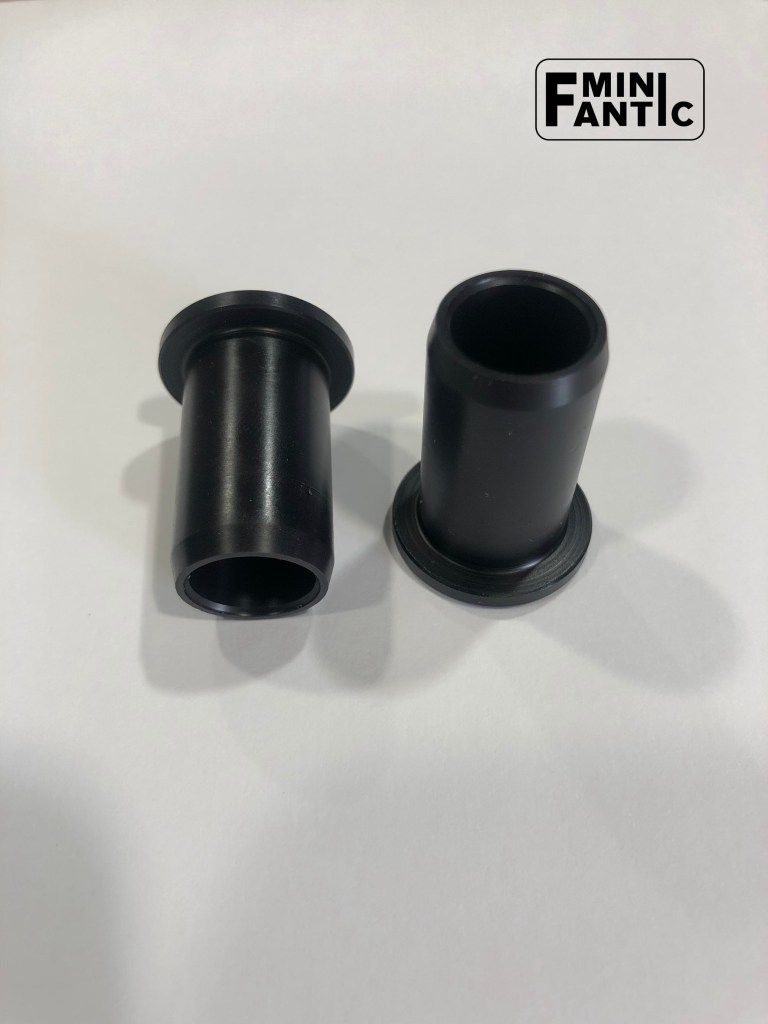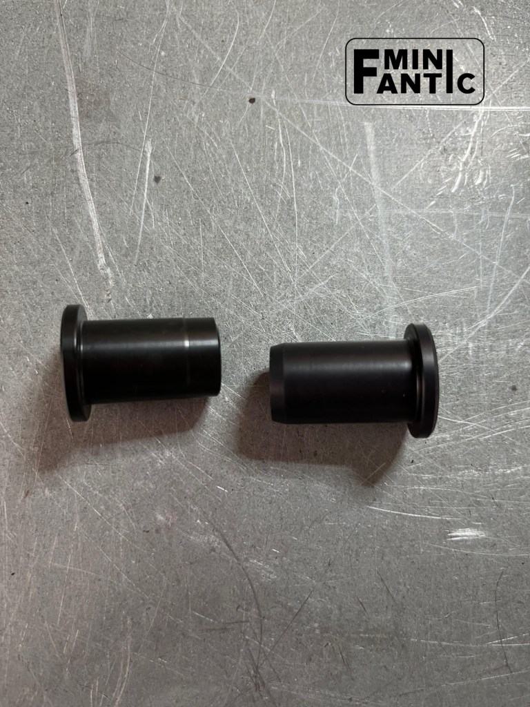 2 Casquillos de material antifricción de delrin, situados en los extremos del eje de freno trasero. Se obtiene una mejora en el tacto del pedal del freno trasero, dado que en el eje se reduce la fricción.
