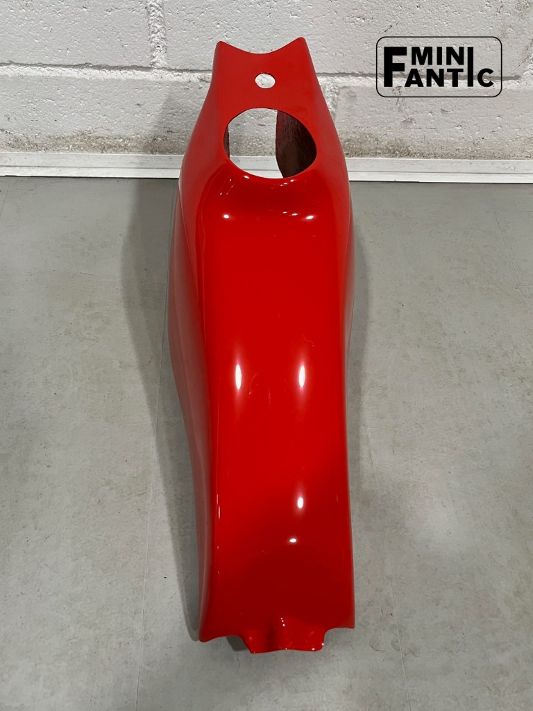 Cubre depósito, para Fantic 200 trial, que se adapta al deposito de plástico existente, de color apagado, de aspecto degradado y sin pintar. El cubre deposito esta fabricado en fibra de vidrio de 1 mm de grueso y tiene la particularidad que presenta una superficie, lisa, pintada y brillante, acorde con la pintura del resto de la moto. Pintado en color rojo y barnizado, es resistente a las rozaduras y a la gasolina. Respecto a un depósito de fibra de vidrio, se evita que los restos de resina que recubren el interior, acaben diluyéndose en la gasolina, pudiendo perjudicar los elementos mecánicos del interior del motor.